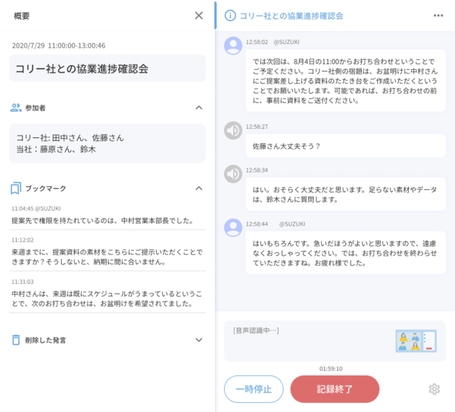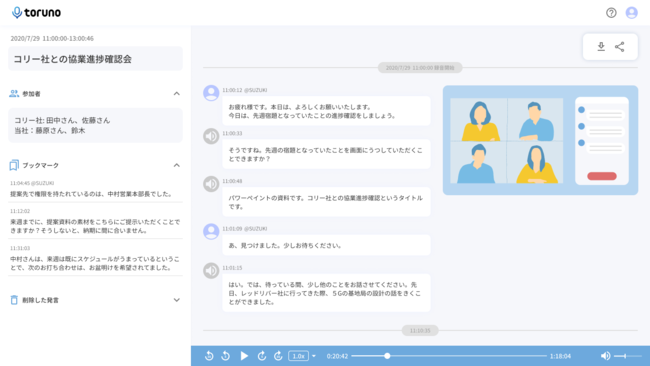 torunoβ版は、手軽に使えることをコンセプトに、わかりやすいシンプルなUIで誰にでも使いやすく、オンライン会議やオンラインセミナーの内容をさまざまな形で記録できるクラウドサービスです。会議音声の録音データに加え、音声認識AIがリアルタイムかつ自動で文字起こし*1したテキストデータ、会議画面をキャプチャした画像データを記録することで、オンライン会議の流れをわかりやすく可視化します。オンライン会議時のノートやエディタの代わりとして、日常的な会議の内容の振り返り、議事録の作成、動画の文字起こしなどの作業をサポートし、ユーザーのテレワークライフを快適にします。