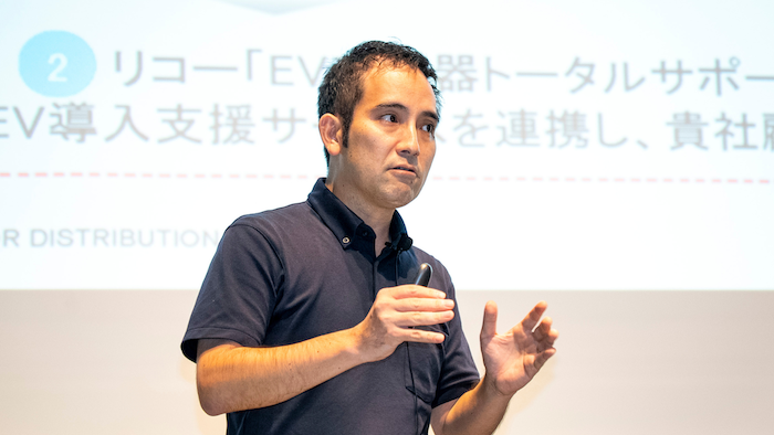 まずはリコー社用車にクラウド型車載器を装着し、 安全運転強化、エコドライブ促進、稼働分析、 CO2排出量の測定、EV導入シミュレーション等を行い、 その成果をもとに共同営業を展開。 将来的には車・充電器・サービス・エネルギーを 月額リース化したパッケージ開発も視野に入れています。
