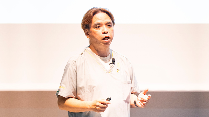 2年ぶり2度目の挑戦となる金子氏は、冒頭で一枚の写真を見せながら前回の挑戦を振り返り、 「非採択となった2年前の帰り道、あまりにも落ち込んで前を見ずに歩いていたら、階段から足を踏み外して骨折しました。」 と語り、審査員の笑いと驚きを誘いながら発表を始めました。